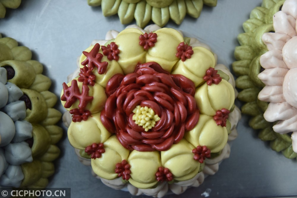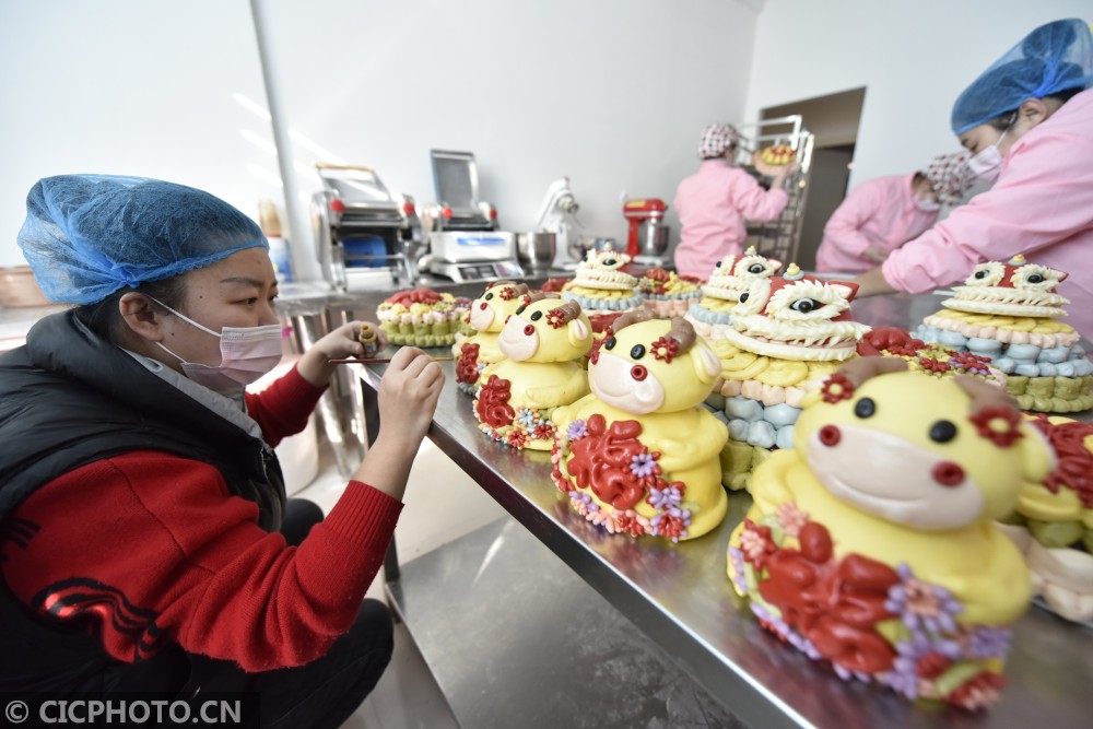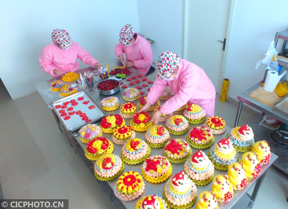 ↑2021年1月18日,在山东省聊城市茌平区一家花糕店,店员在给花糕上颜色。CICPHOTO/赵玉国 摄