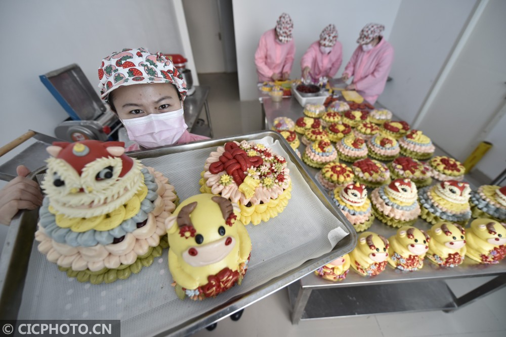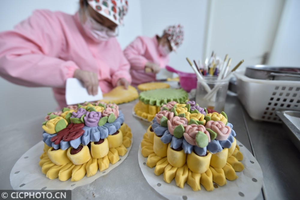 ↑2021年1月18日,在山东省聊城市茌平区一家花糕店,店员们在展示制作的五彩花糕。CICPHOTO/赵玉国 摄