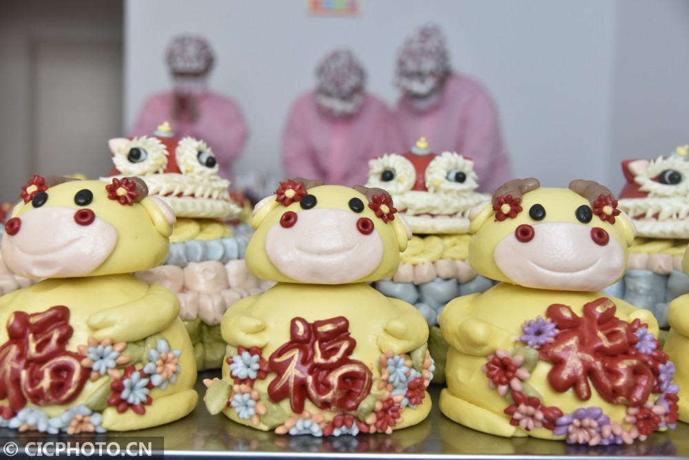 春节临近,山东省聊城市茌平区花糕店的五彩花糕订单逐渐多起来。店员师傅们把传统手艺和时尚创新相结合,用蔬菜榨汁和面制作而成五彩花糕,创作了牛年迎福、春风得意、福上加福、招财进宝、红红火火等“作品”,深受市民喜欢。