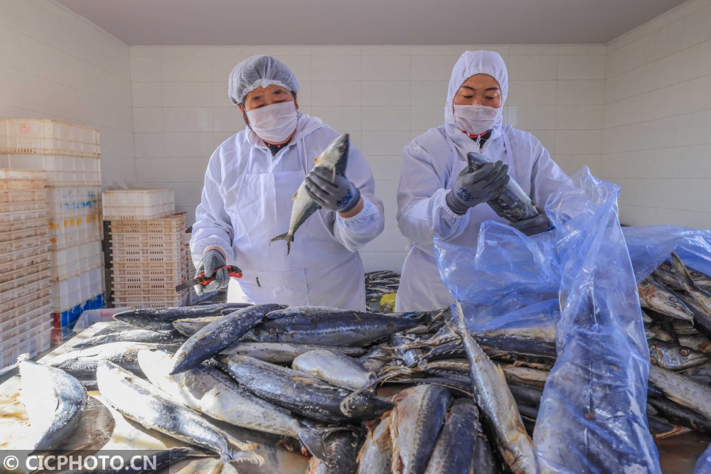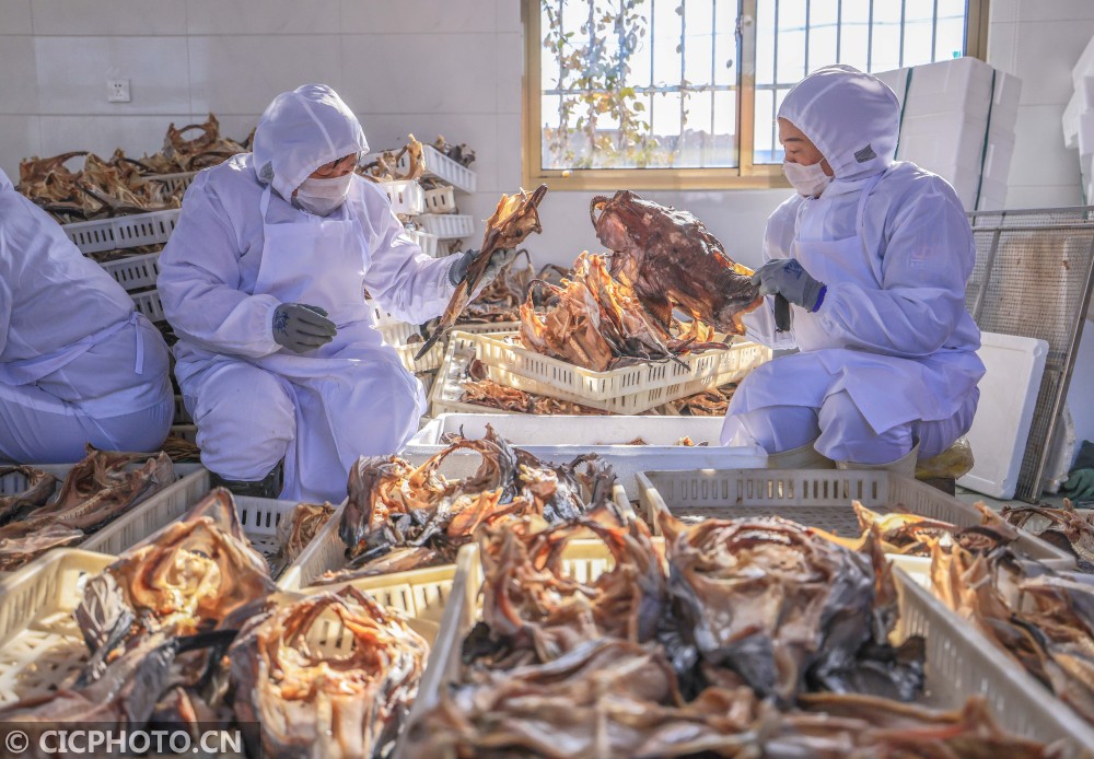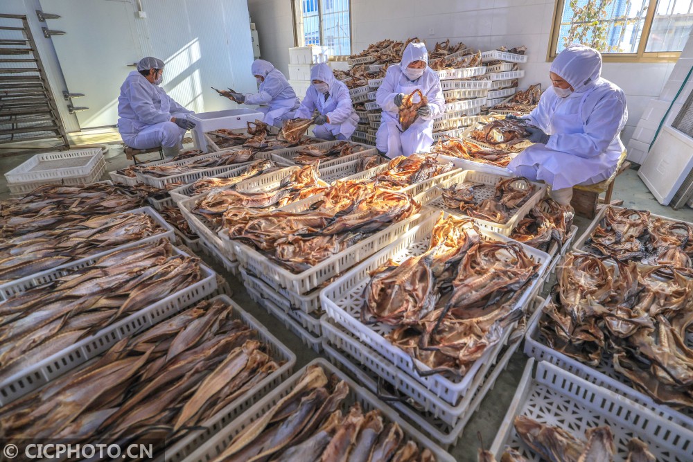 ↑2021年1月18日,在山东省荣成市石岛管理区王连街道一处渔家小院,村民们将晾晒好的咸鱼干打包装箱。CICPHOTO/李信君 摄