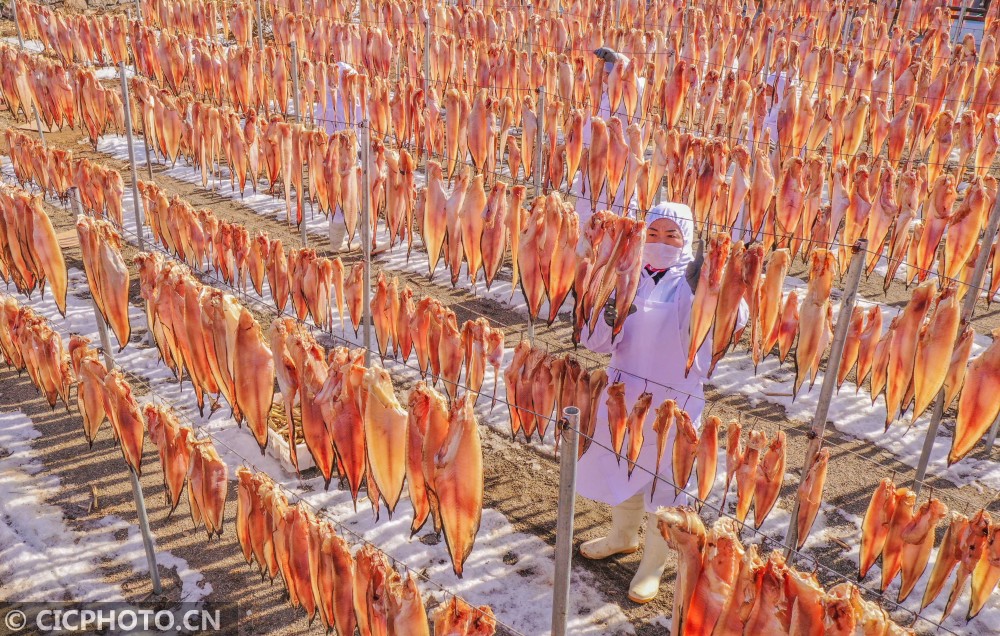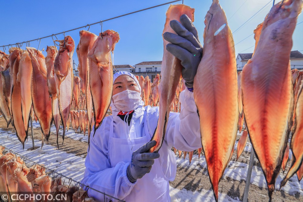 ↑2021年1月18日,在山东省荣成市石岛管理区王连街道一处渔家小院,村民们在晾晒鱼干。CICPHOTO/李信君 摄