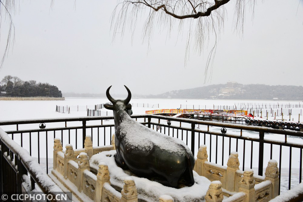 ↑2021年1月19日,北京颐和园昆明湖畔的铜牛上布满落雪。CICPHOTO/樊甲山 摄