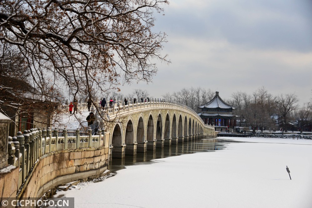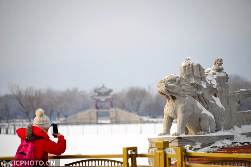 ↑2021年1月19日,游客在颐和园十七孔桥前拍照。CICPHOTO/樊甲山 摄