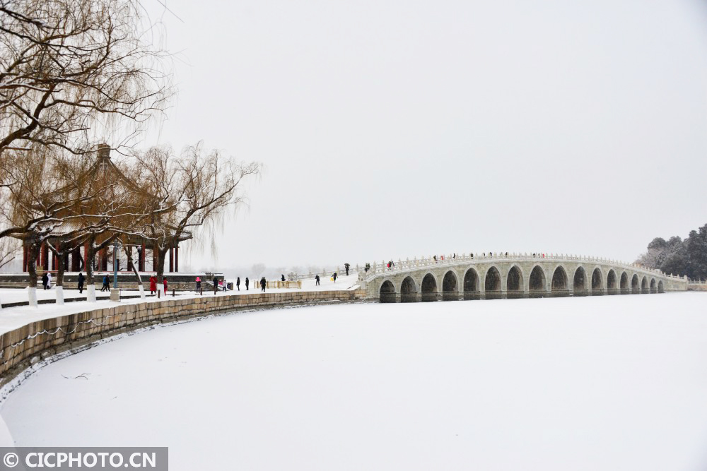 ↑2021年1月19日,北京颐和园内的十七孔桥被包裹在银装素裹的白雪世界里。CICPHOTO/樊甲山 摄