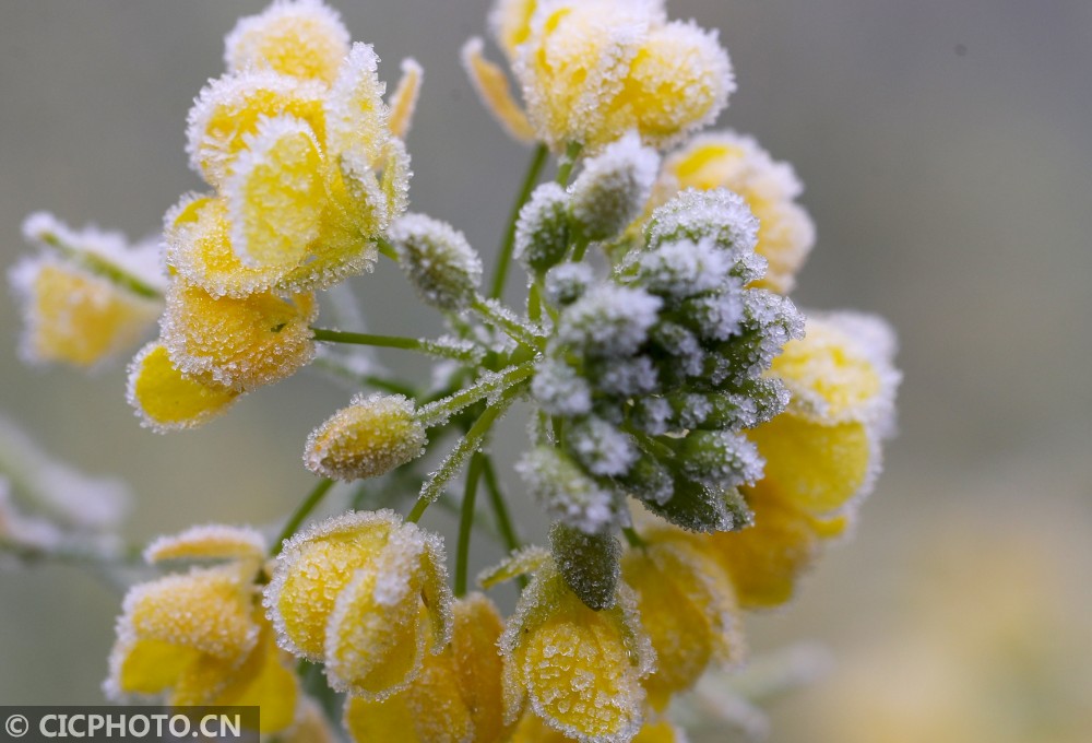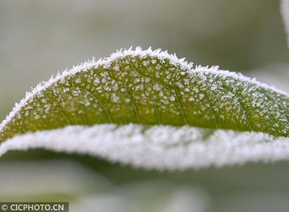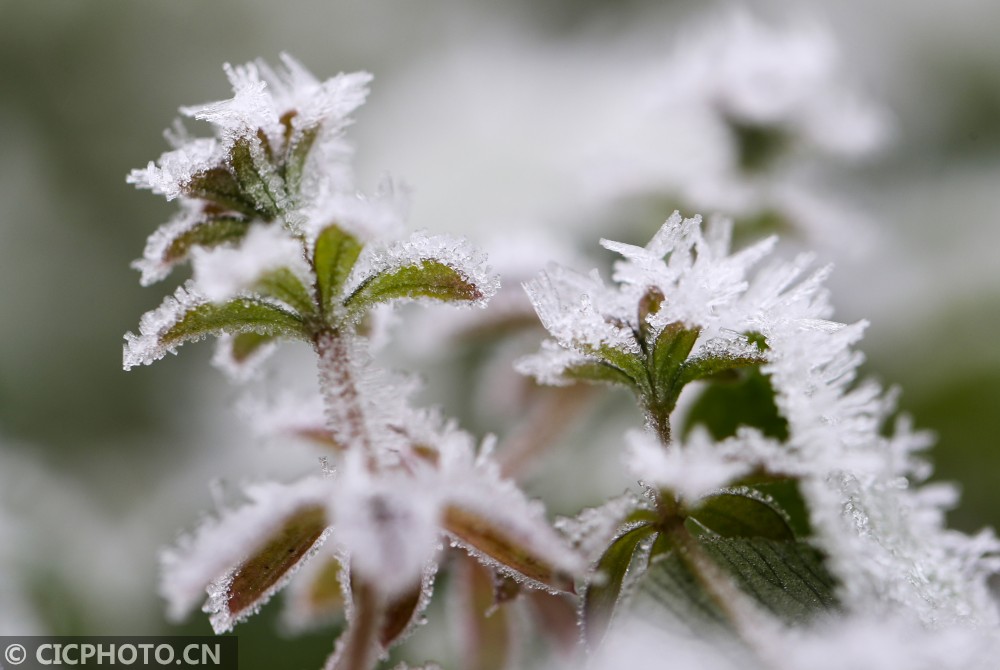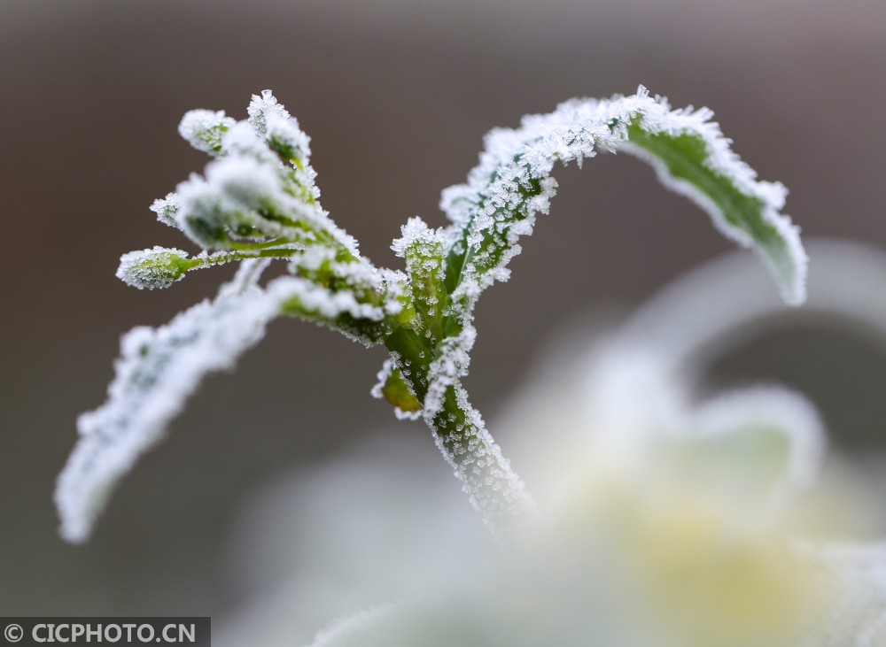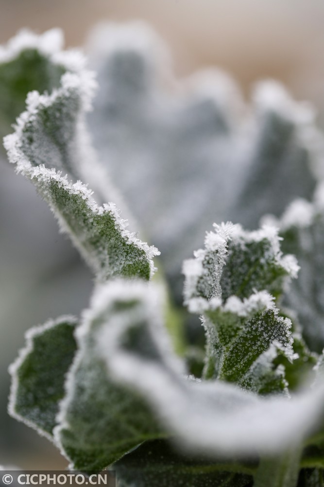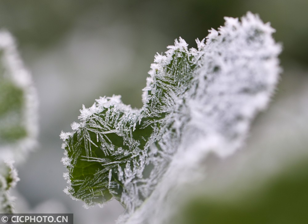 天气寒冷,在贵州省铜仁市玉屏侗族自治县的乡村田园里,蔬菜、树叶等植物上凝结出雪白的霜花,晶莹剔透,美不胜收。
