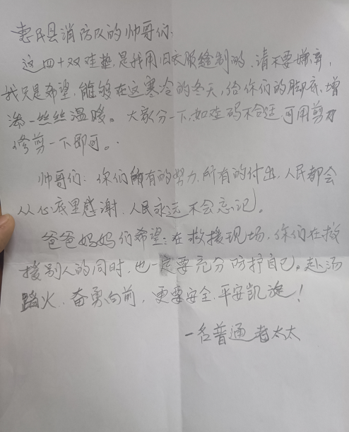 近日,山东滨州惠民县消防救援大队消防员救火归来后,收到40双手工缝制鞋垫。这些手工鞋垫来自于当地一名普通老人。老人留下一张字条感谢消防员的辛苦付出。(素材来源:山东滨州市惠民县消防救援大队)
