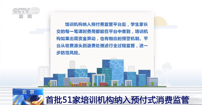 为进一步规范预付式消费市场,北京市石景山区在全市范围内率先推出石景山区预付式消费信用监管和服务平台,有序开展全区各类经营商户预付式消费业务的上线工作。培训机构纳入预付费监管平台后,学生家长交的每一笔课时费用都能在平台中查到,培训机构如果出现资金异动也有相应的预警机制。平台从收费源头到退费处理进行全过程监管,进一步防范风险。下一步,石景山区教委将进一步加大预付式消费信用监管推进力度,凡是新审批的机构必须第一时间完成平台上线注册,并向社会公布注册名单,让更多机构加入平台,做到应纳尽纳、全部纳入,保护学生、家长合法权益。