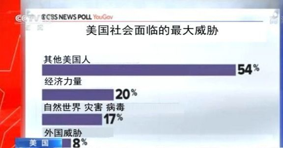 美国哥伦比亚广播公司17日发布了一份民意调查,探讨美国人认为美国社会面临的最大威胁是什么。民调数据显示,有54%的受访者表示,“其他美国人和国内敌人”目前对美国社会构成了“最大威胁”。另有约20%的人认为最大威胁为“经济力量”,而一向被部分政客挂在嘴边的“外国威胁”,得票率仅占约8%。