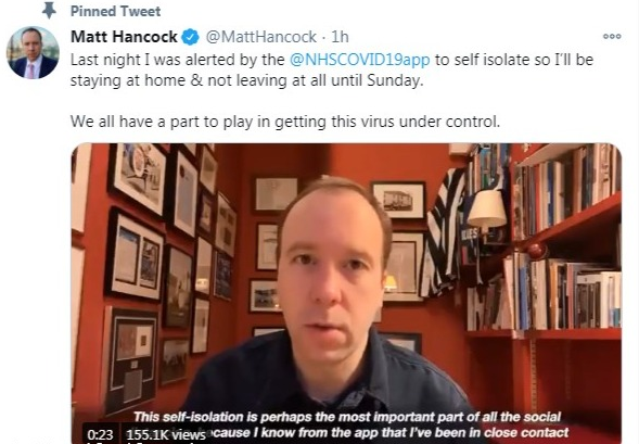 当地时间1月19日上午,英国卫生大臣汉考克通过社交媒体表示,经新冠病毒追踪手机软件提示后,他已经开始在家进行自我隔离。