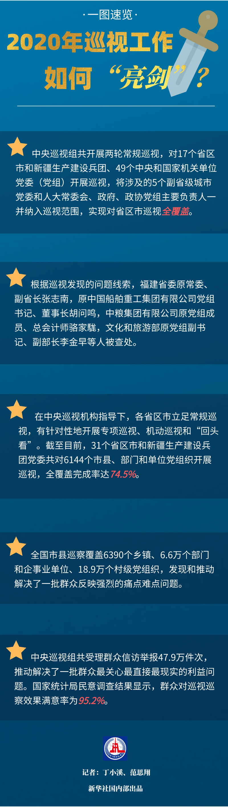数据显示,2020年中央巡视组共受理群众信访举报47.9万件次,推动解决了一批群众最关心最直接最现实的利益问题。国家统计局民意调查结果显示,群众对巡视巡察效果满意率为95.2%。(记者丁小溪、范思翔)