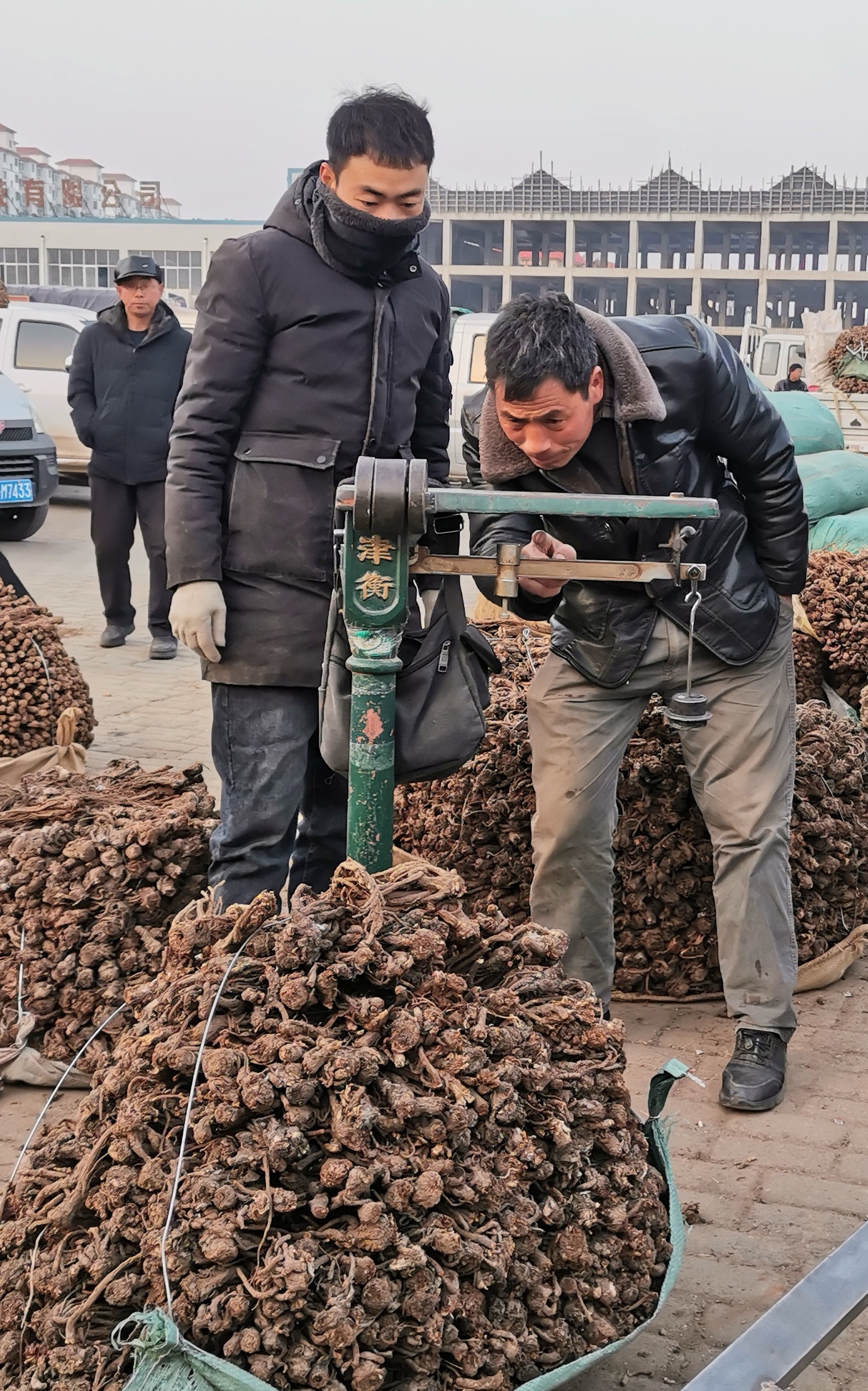 1月15日,药农和客商在甘肃省定西市岷县的中国当归城对当归过秤。