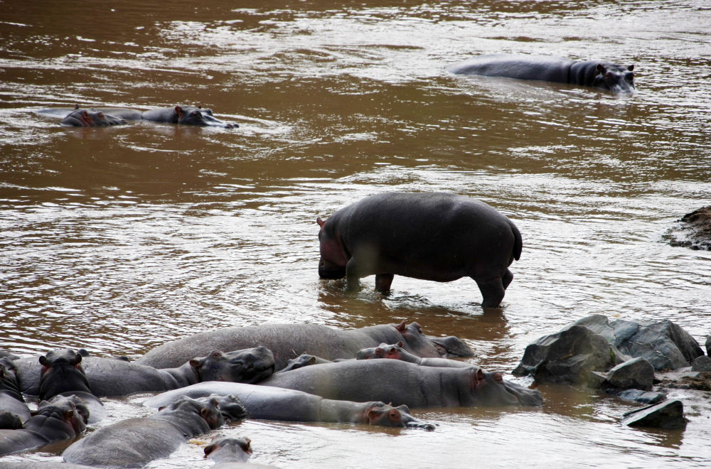 2011年8月23日,在位于肯尼亚西南部的马赛马拉国家公园内,一个野生河马家族在河里活动。(新华社记者张锦摄)