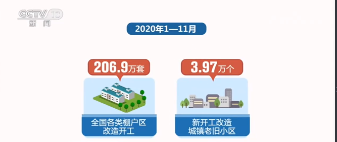2020年1—11月,全国各类棚户区改造开工206.9万套;新开工改造城镇老旧小区3.97万个,惠及居民700多万户。环境质量不断提高,地级及以上城市建成区黑臭水体消除比例达96%,地级及以上城市空气质量优良天数比率提高到87%。