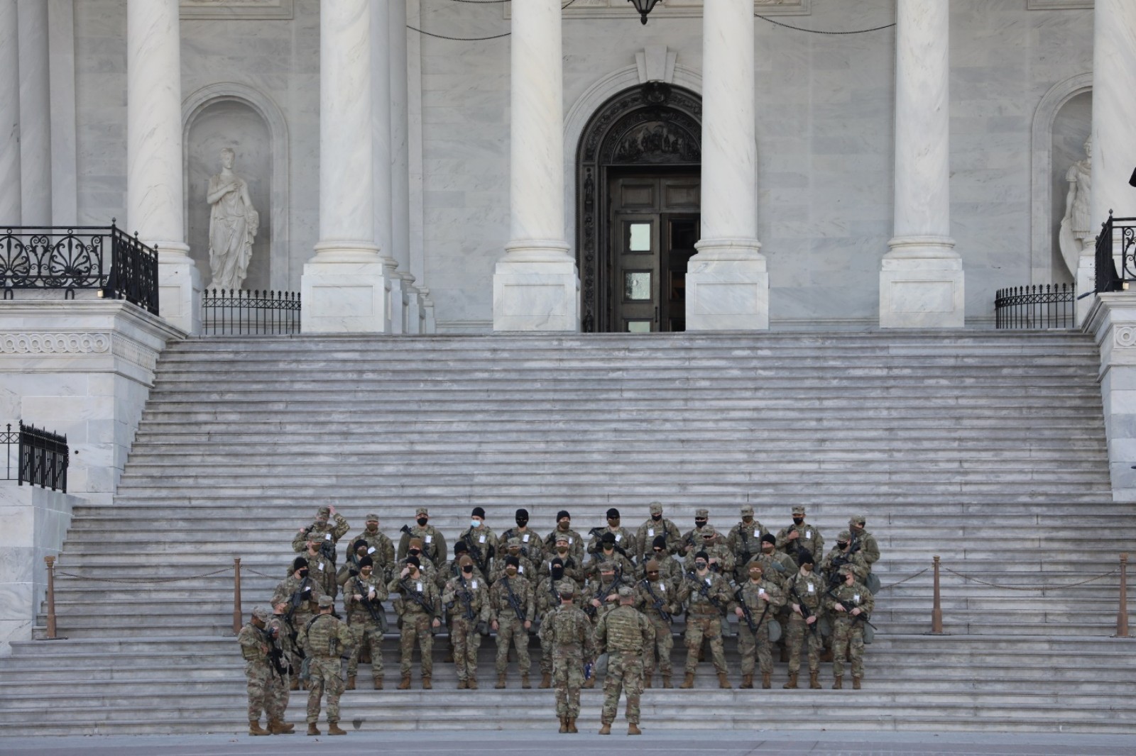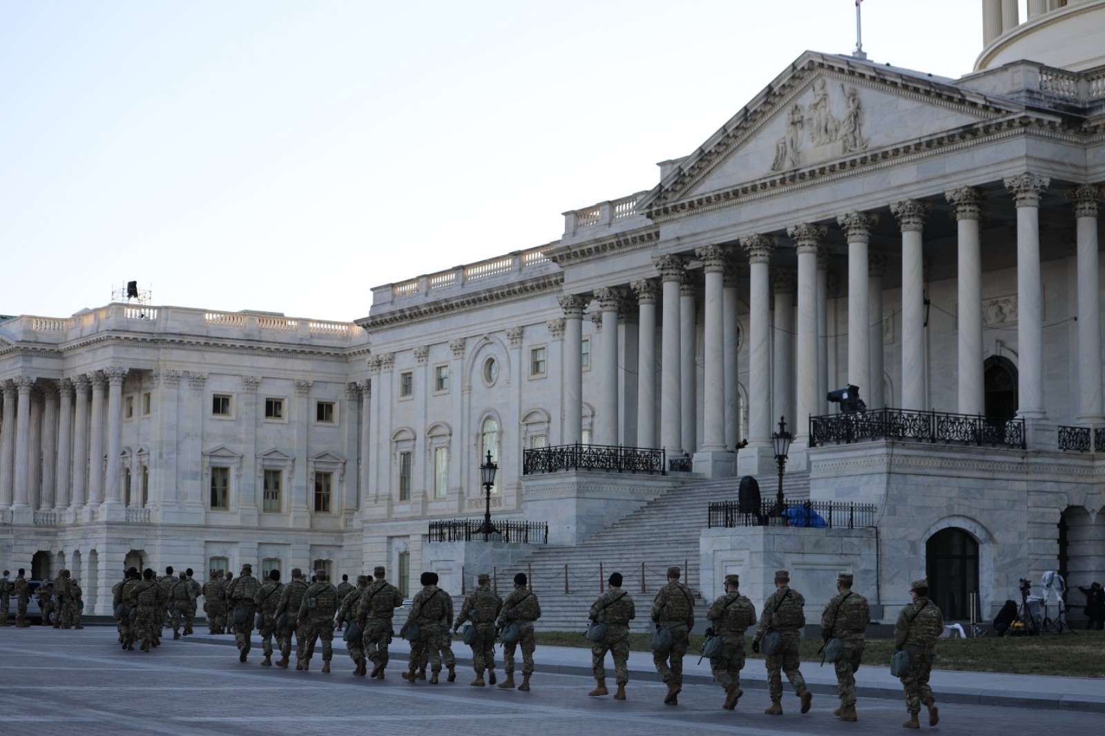 1月19日傍晚,国民警卫队员在国会大厦外的台阶上集合。(来源:人民日报把客户端 张梦旭 摄)