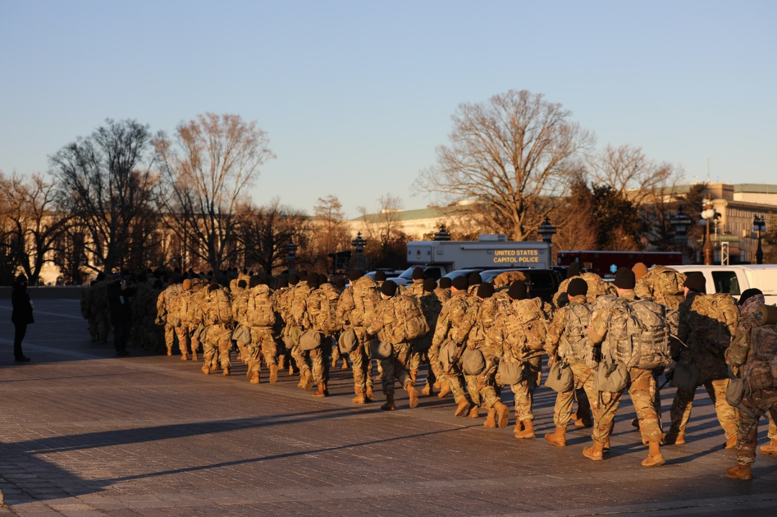 1月19日傍晚,一群国民警卫队员刚刚乘坐大巴抵达国会大厦附近进行部署。(来源:人民日报把客户端 张梦旭 摄)