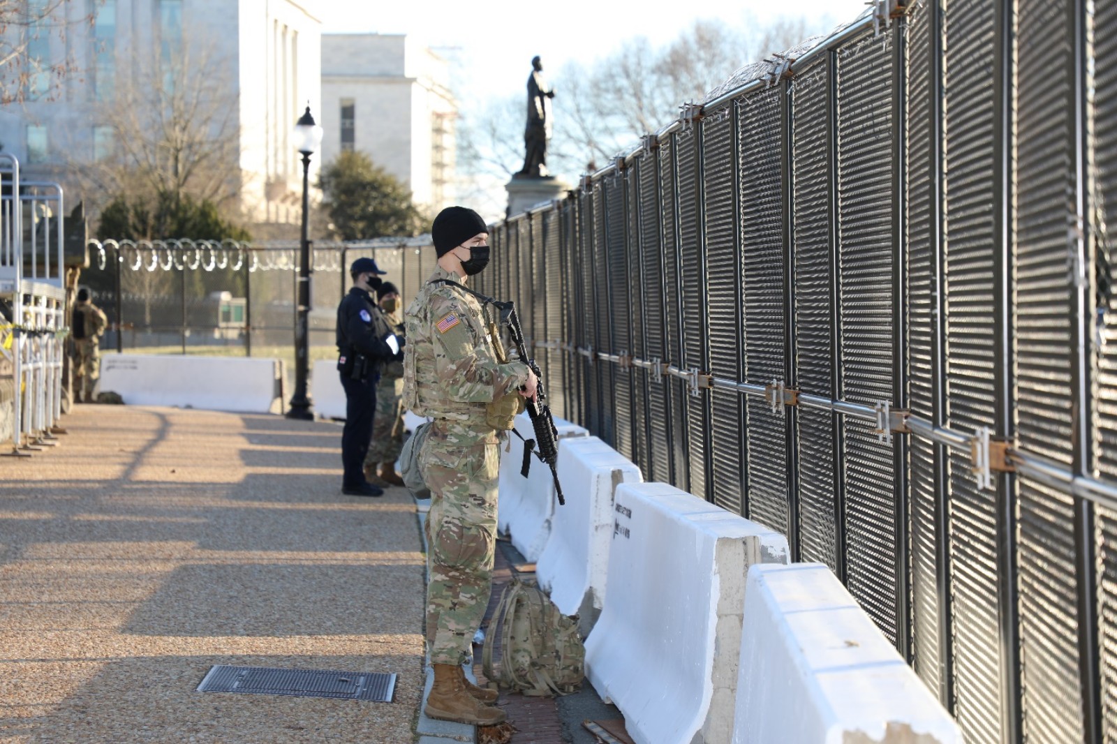 1月19日下午,在国会大厦外最后一道安全围栏前执勤的国民警卫队员。在这道围栏外,还设立了数道封锁线和安全围栏。(来源:人民日报把客户端 张梦旭 摄)