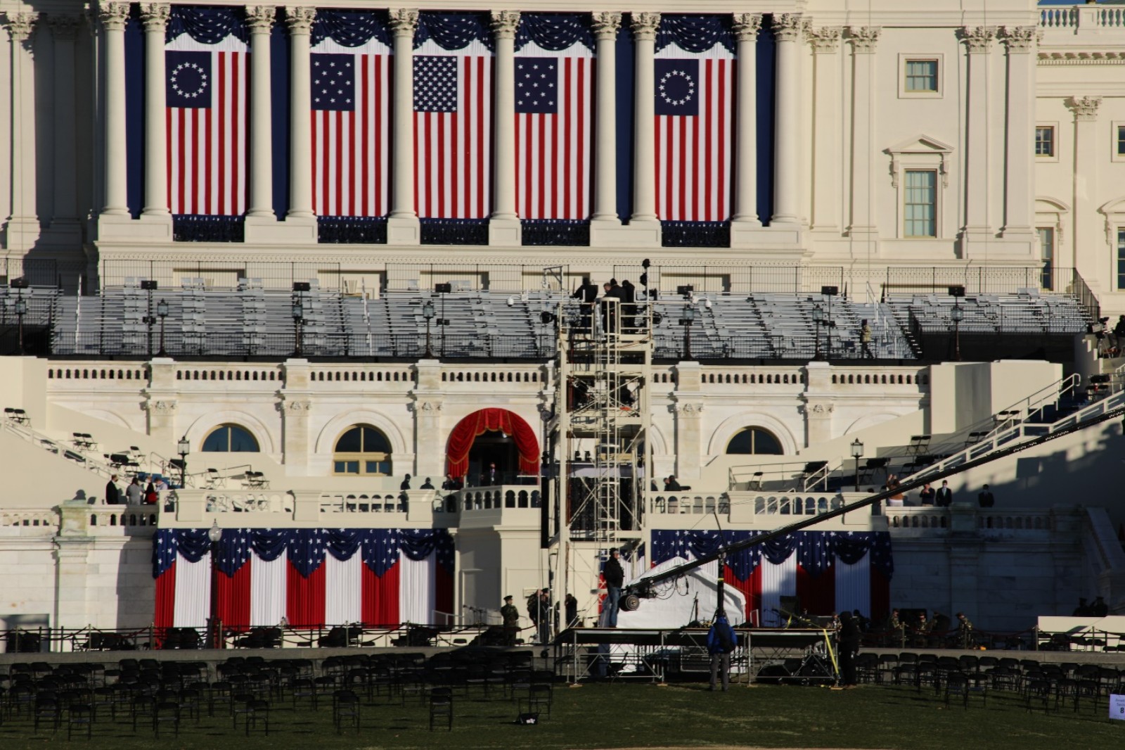 1月19日下午,工作人员正在对总统就职典礼平台进行最后的完善。20日,当选总统和副总统将在这里就职。(来源:人民日报把客户端 张梦旭 摄)
