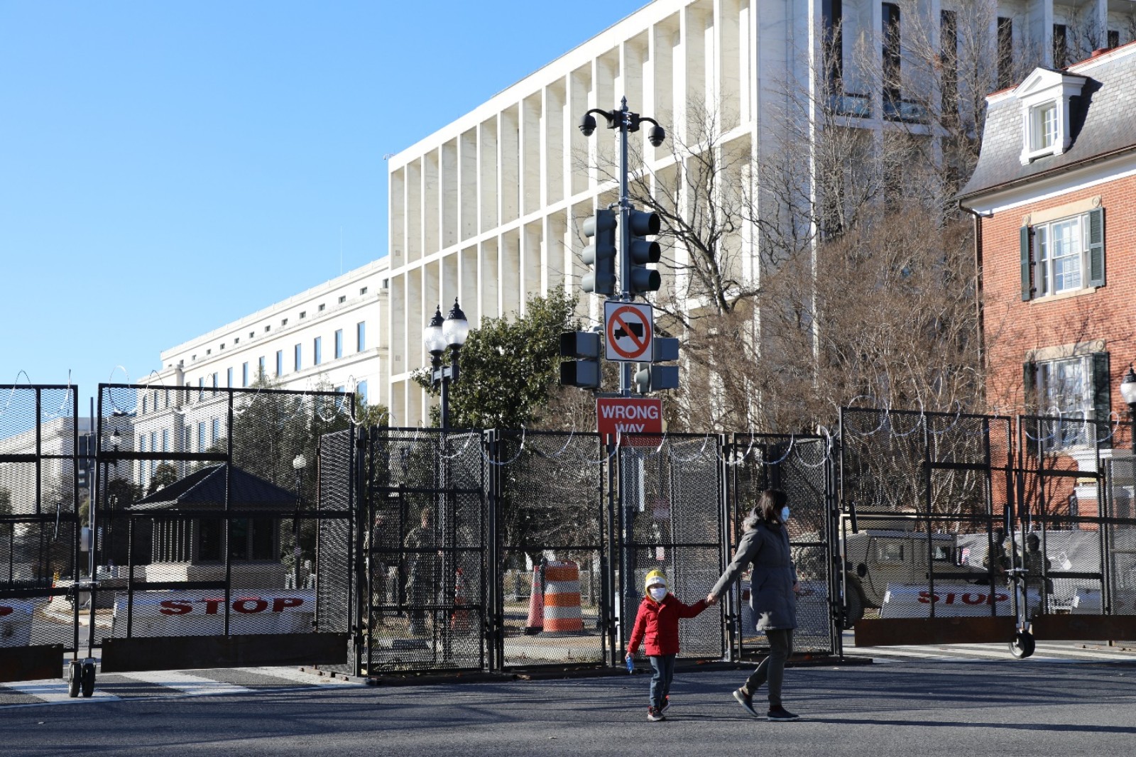 当地时间1月20日,民主党人拜登将宣誓就任美国第46任总统。近来,美国国会骚乱阴云未散,首都华盛顿安保严密堪比战地。记者19日在华盛顿特区看到,城市核心区域已经完全封闭,弗吉尼亚州通往华盛顿特区的数座桥梁也被关闭了。图为1月19日下午,一对母女走过国会大厦附近的安全围栏。(来源:人民日报把客户端 张梦旭 摄)