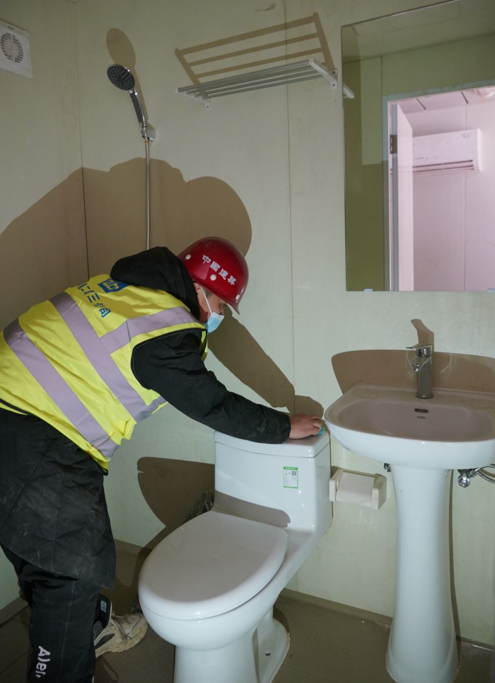 ▲1月19日,工人在石家庄黄庄公寓集中隔离场所工地准备交付的房屋内进行整理。