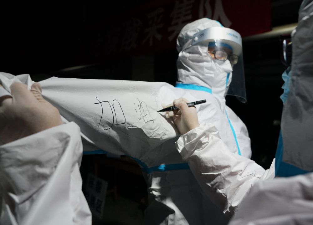 ▲1月7日,在石家庄市裕华区九里庭院社区,医护人员在防护服上写下“加油”相互鼓励。