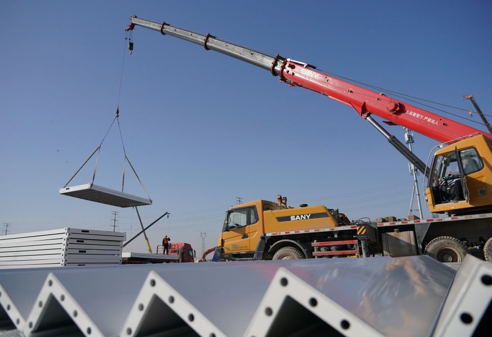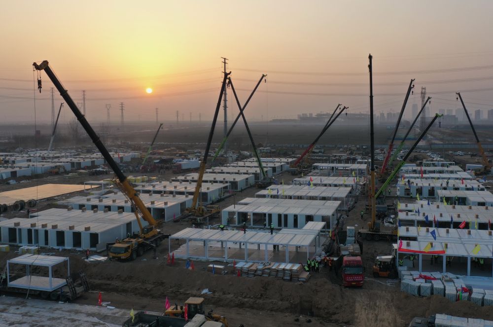 ▲1月18日,工人在石家庄黄庄公寓隔离场所项目工地吊运集成房屋板材。