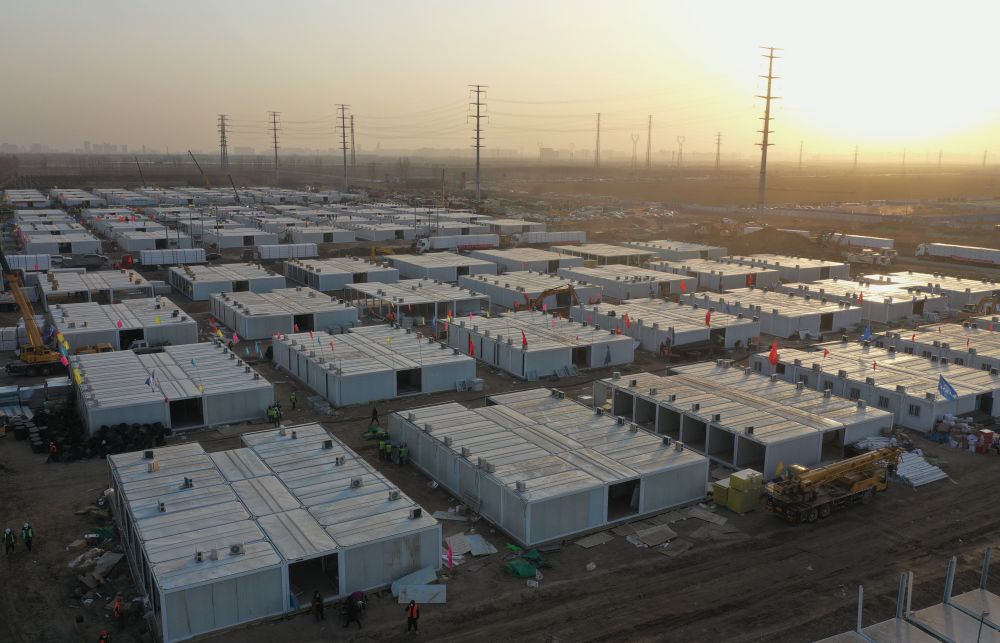 ▲1月19日,工人在石家庄黄庄公寓集中隔离场所工地施工。