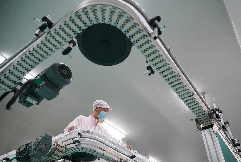 ▲1月13日,石家庄四药有限公司员工在输液制剂生产线上工作。