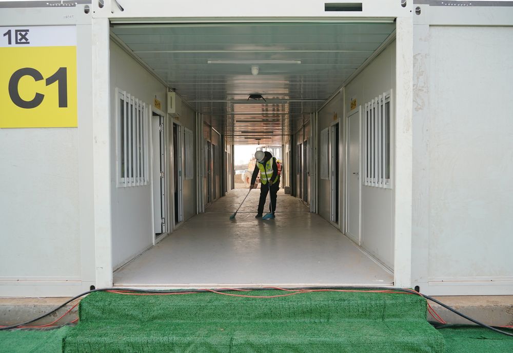 ▲1月19日,工人在石家庄黄庄公寓集中隔离场所工地整理准备交付房屋地面。