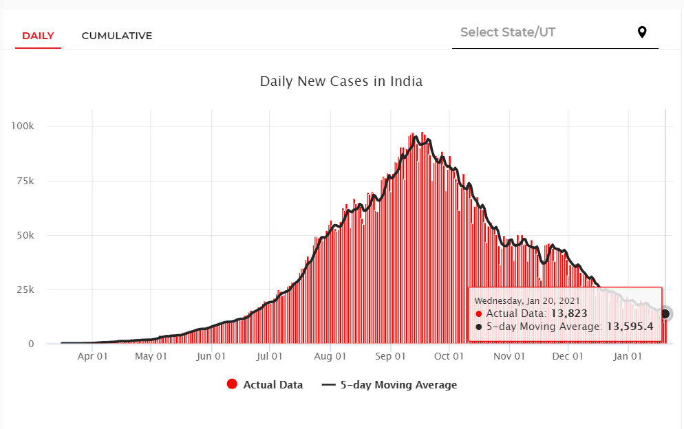 当地时间20日早8时(北京时间10时30分),印度卫生部发布消息,24小时内印度新增新冠肺炎确诊病例13823例,累计确诊达10595660例;新增死亡病例162例,累计死亡152718例;累计治愈10245741例。