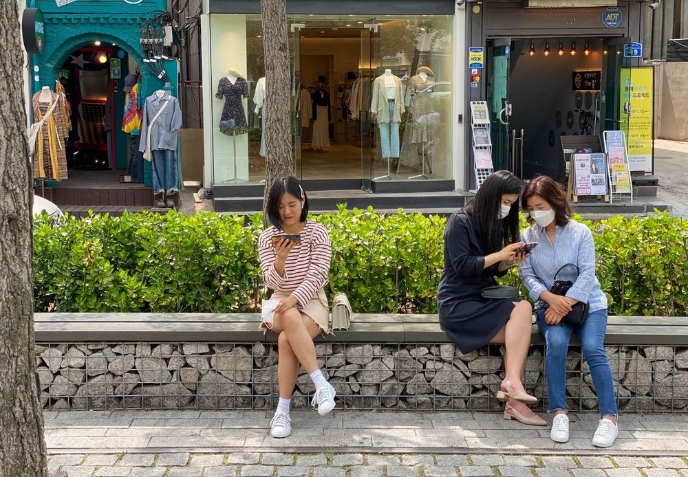2020年5月3日,在韩国首都首尔,人们在弘益大学附近休闲。(新华社记者王婧嫱摄)