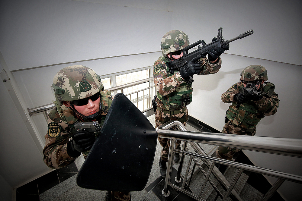 特战队员在楼梯搜索前进。王治国 摄
