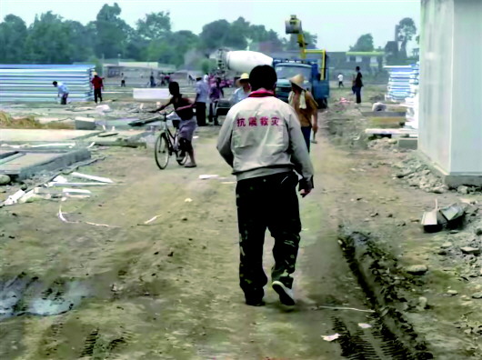 ▲2008年6月,安磊在四川什邡“抗震救灾”前线从事志愿服务,搬运简易板房的保温板。