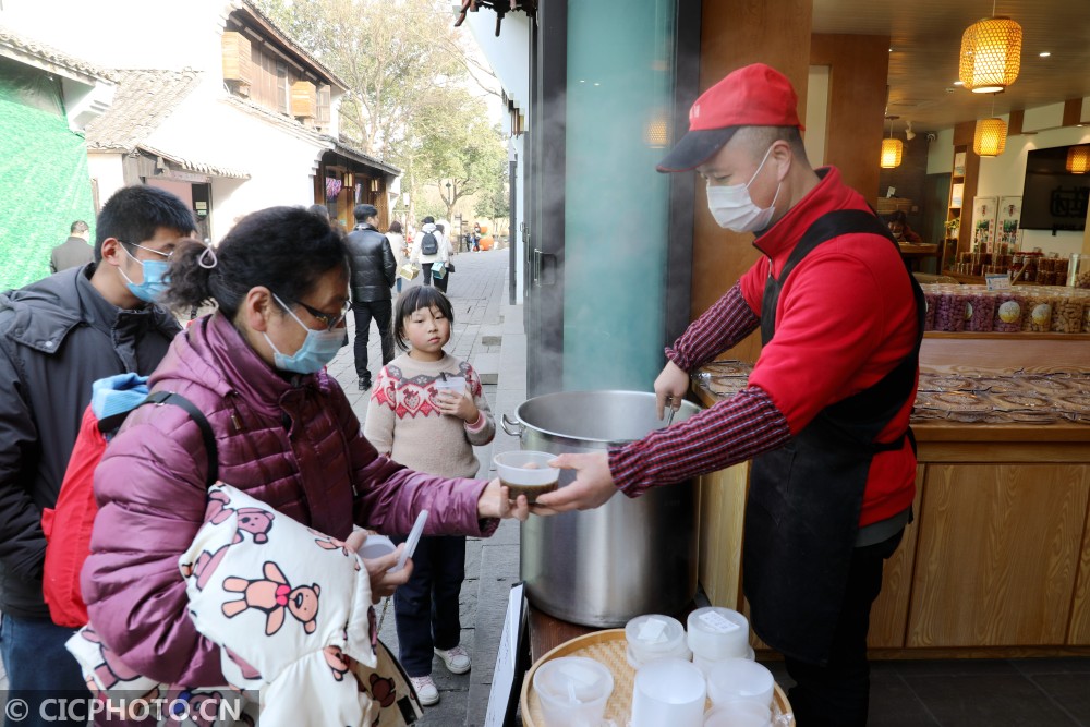 ↑2021年1月17日,浙江省杭州西溪国家湿地景区一商家的工作人员在为过往市民游客免费发放腊八粥。CICPHOTO/徐根柱 摄