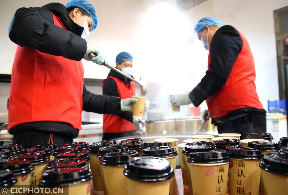 ↑2021年1月20日,河北省邢台市柏乡县的爱心志愿者将煮熟的“腊八粥”分装到纸杯中。CICPHOTO/李雪其 摄