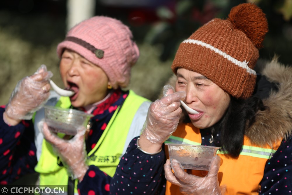 ↑2021年1月19日,江苏省连云港市灌云县环卫工人在品尝志愿者送上的腊八粥。CICPHOTO/吴晨光 摄