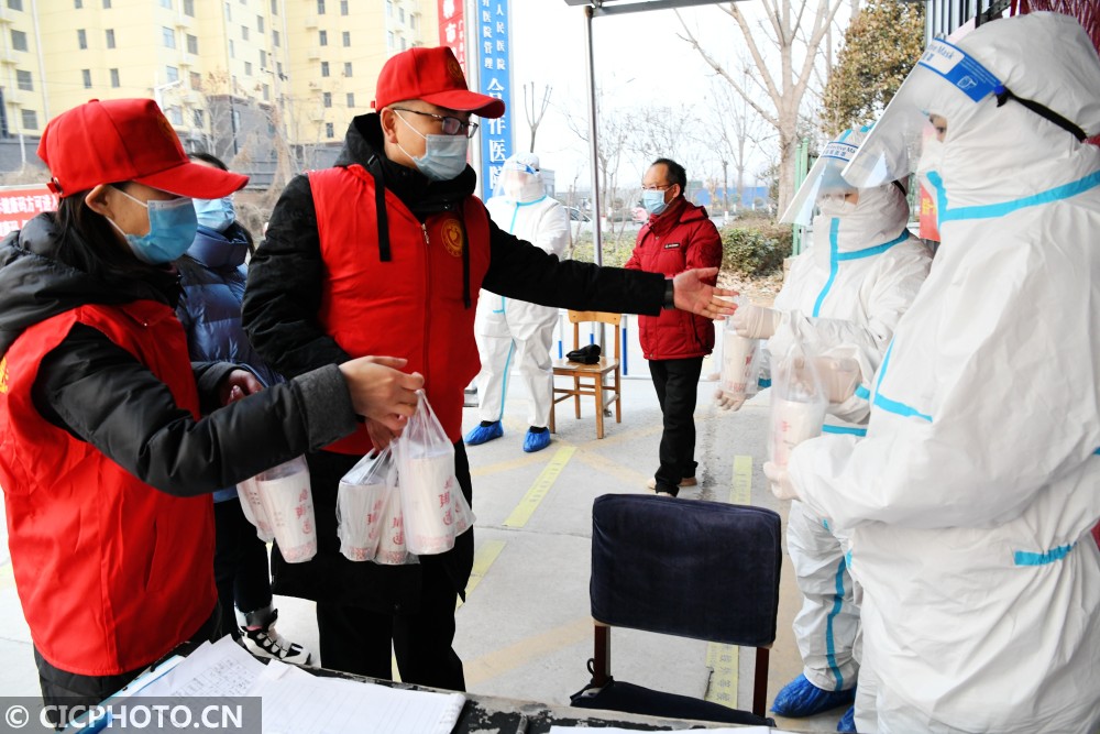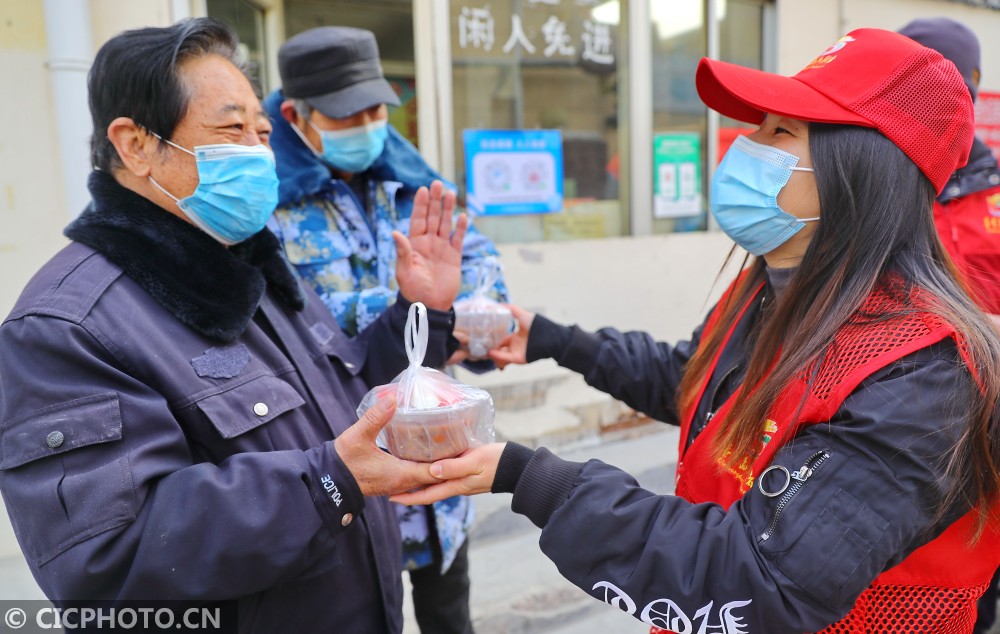 ↑2021年1月19日,在河北省秦皇岛市海港区团结里社区,志愿者为防疫值守人员送上腊八粥。CICPHOTO/曹建雄 摄