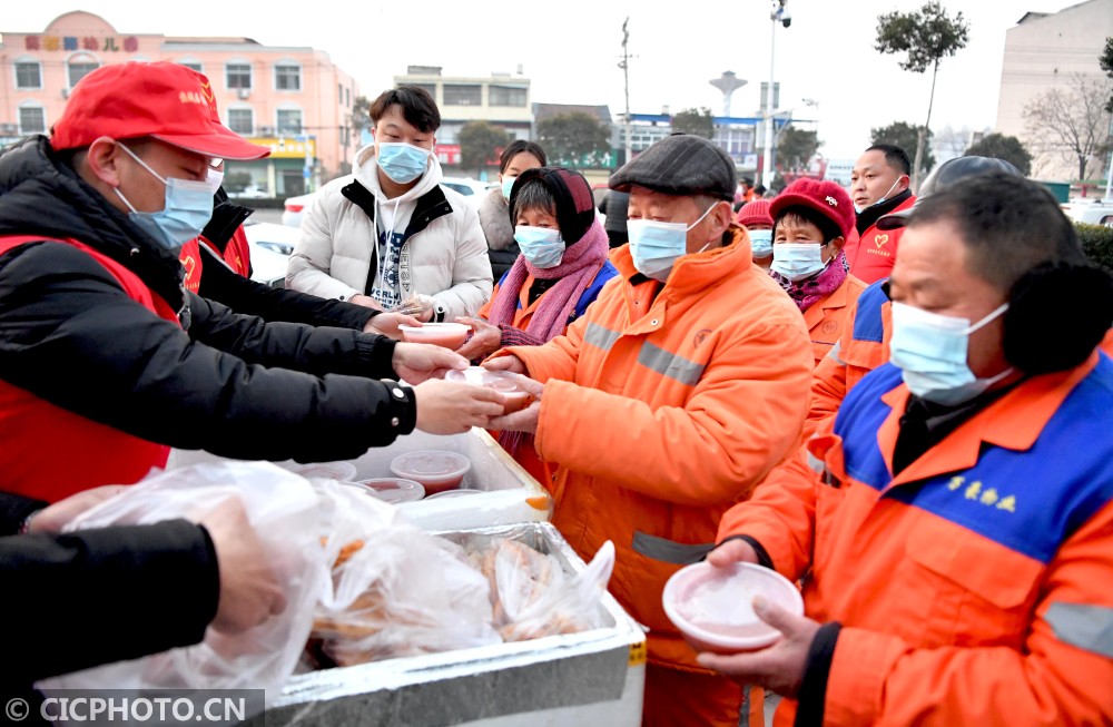 ↑2021年1月20日,在安徽省亳州市谯城区药都大道建投桐花园小区门口,谯城区青年志愿者协会志愿者给环卫工人送腊八粥。CICPHOTO/刘勤利 摄
