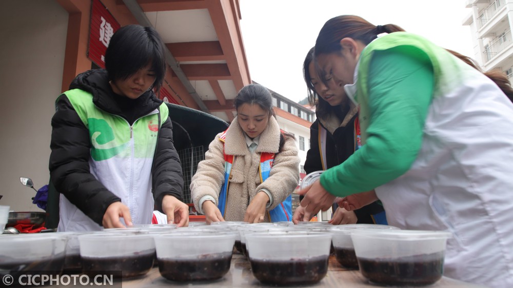 ↑2021年1月20日,在贵州省铜仁市万山区丹都街道龙生社区,青年志愿者在打包熬制好的腊八粥。CICPHOTO/叶顺强 摄