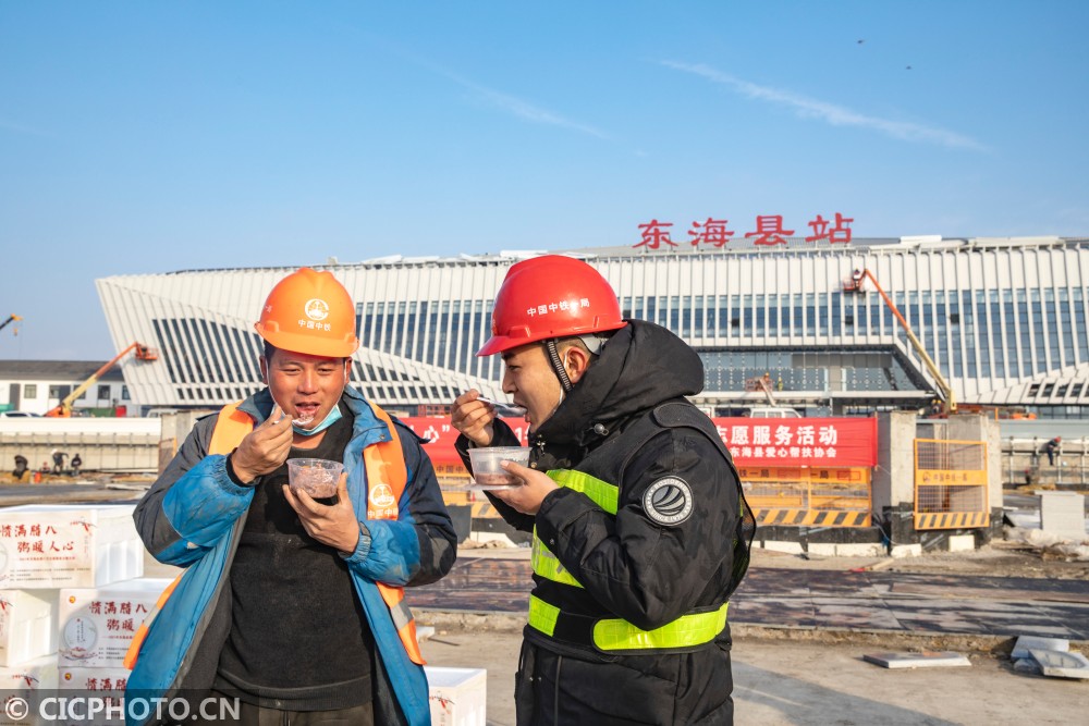↑2021年1月20日,在江苏省连云港市东海县徐连高铁东海县站建设工地上,工人们在品尝志愿者们送上的腊八粥。CICPHOTO/柴军委 摄