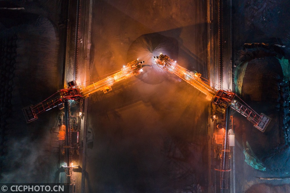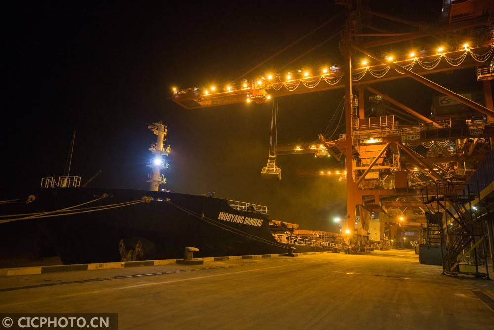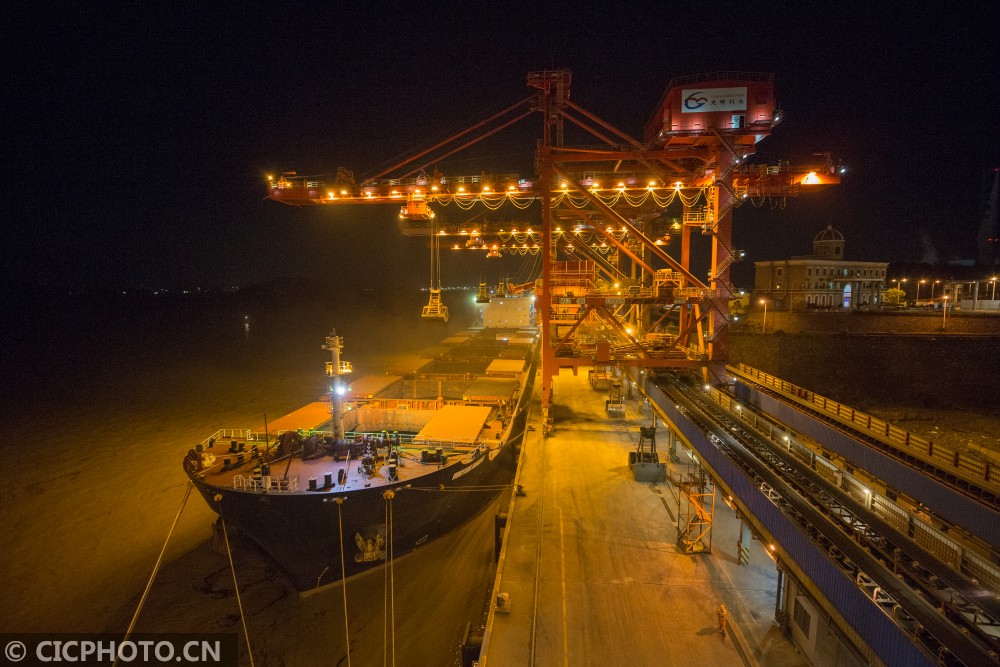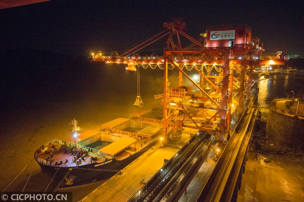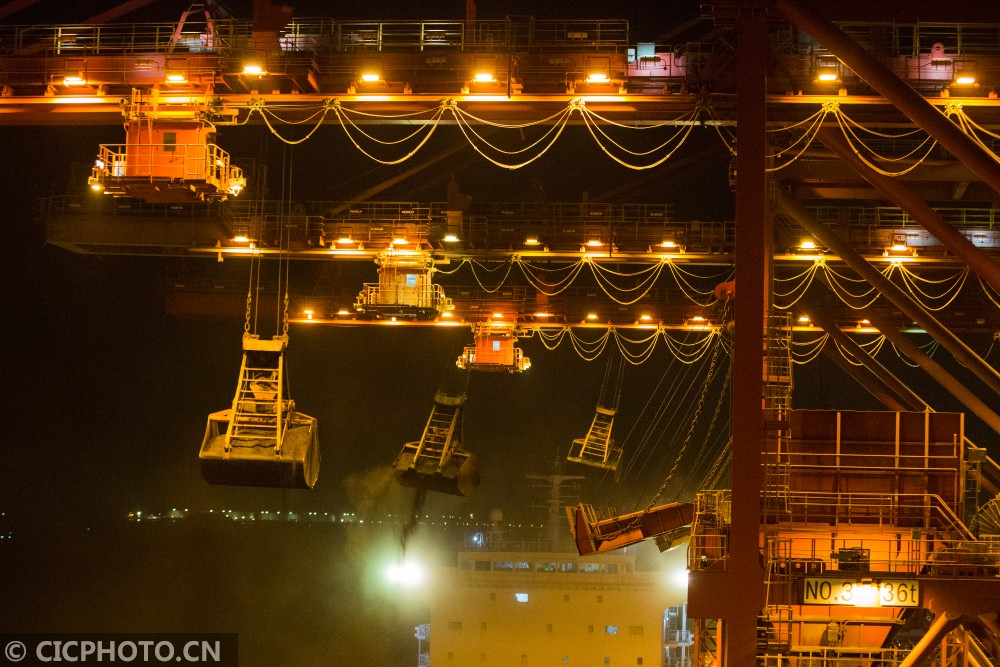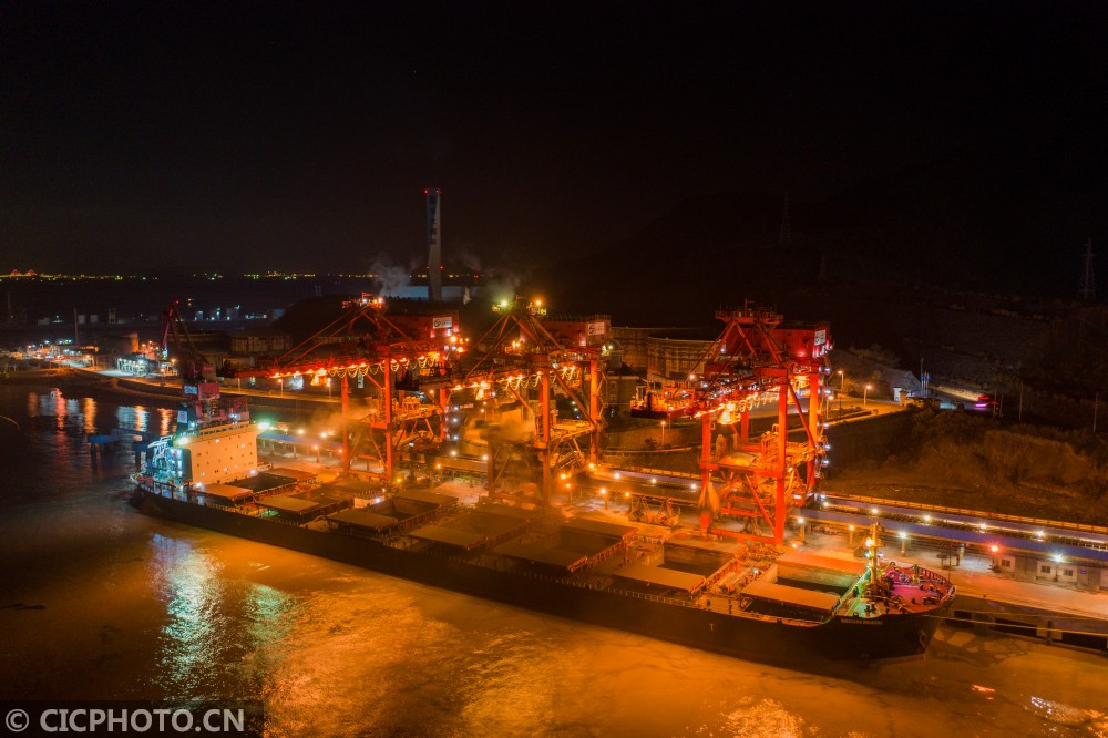 以上图片:浙江省宁波市舟山港穿山港区光明码头灯火通明,装载着6.6万吨俄罗斯动力煤的“班德斯”货轮在紧张抢卸作业。CICPHOTO/蒋晓东 摄