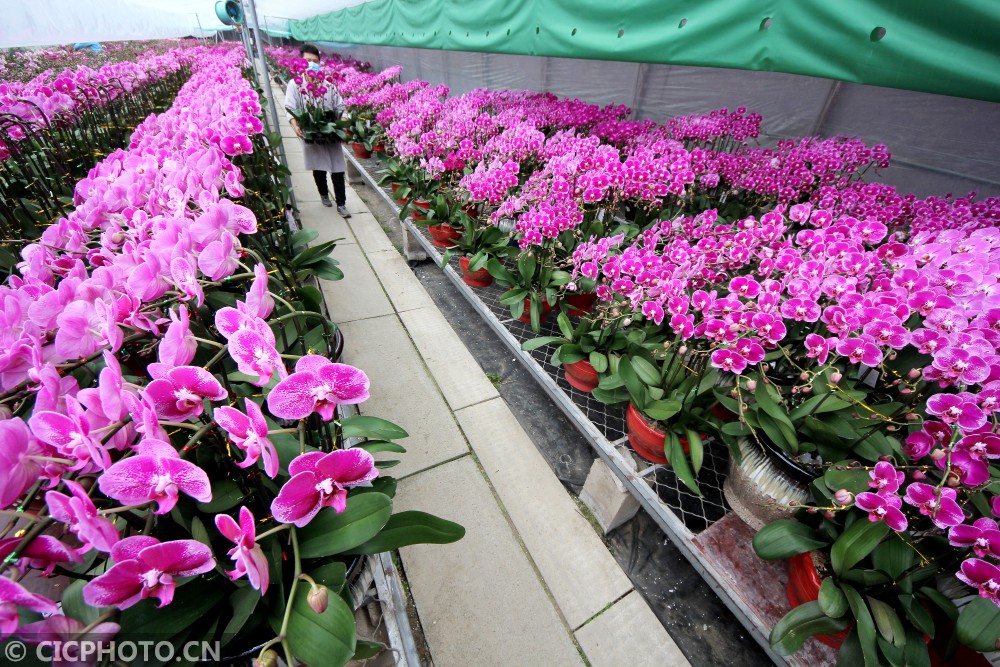 春节临近,山东省枣庄市市中区蔡庄村安邦家庭农场温室大棚内一派繁忙景象,绽放的蝴蝶兰如一只只彩蝶飞舞。农民忙着对蝴蝶兰进行整枝、上盆、浇水等管护工作,供应春节花卉市场,为新春佳节增添喜庆气氛。