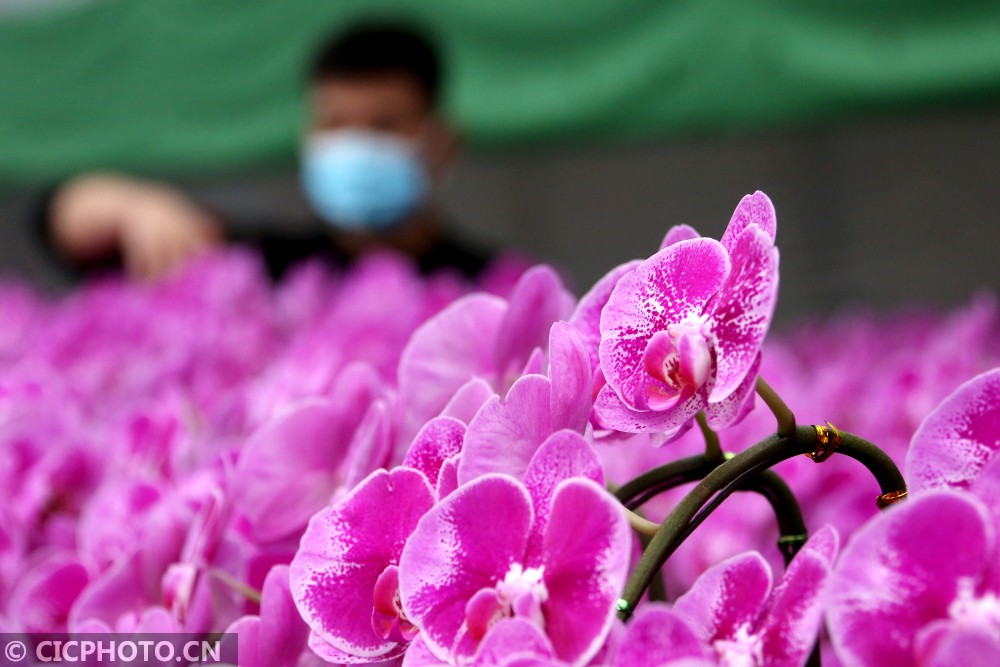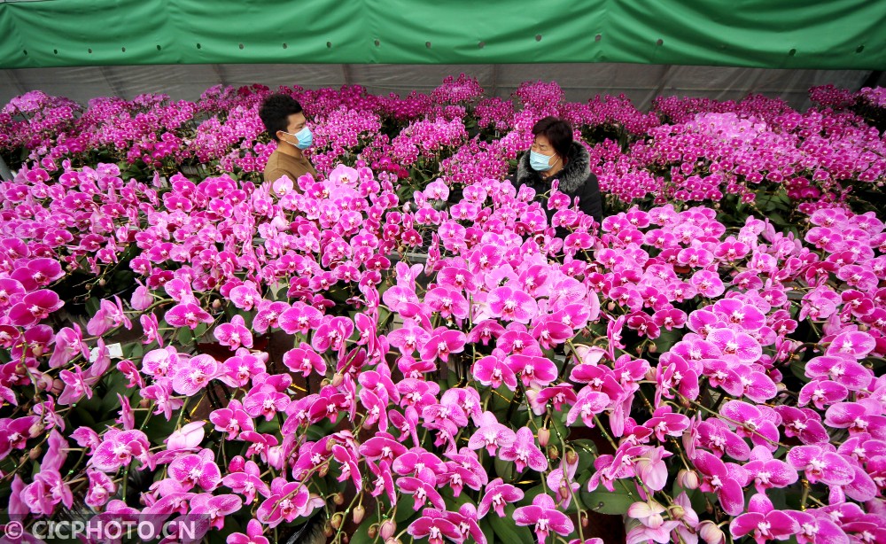 ↑2021年1月20日,市民在山东省枣庄市市中区蔡庄村安邦家庭农场的温室大棚内选购蝴蝶兰花卉。CICPHOTO/吉喆 摄