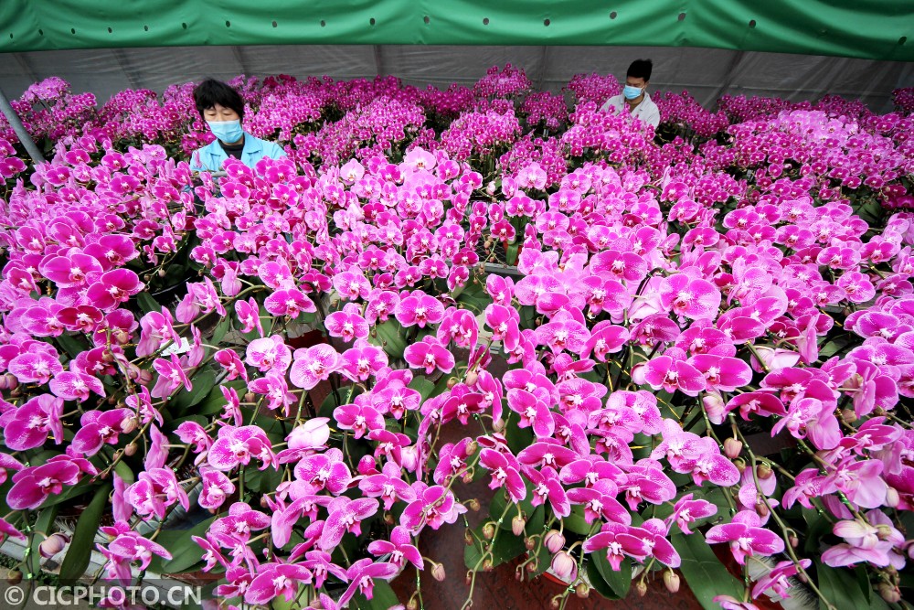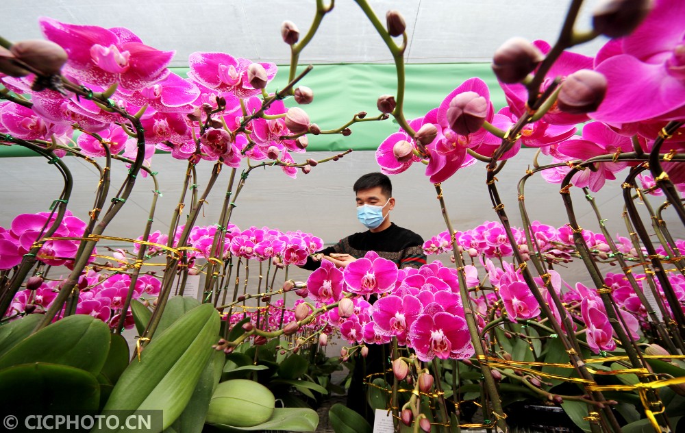 ↑2021年1月20日,山东省枣庄市市中区蔡庄村安邦家庭农场的农民在温室大棚内管理蝴蝶兰花卉。CICPHOTO/吉喆 摄