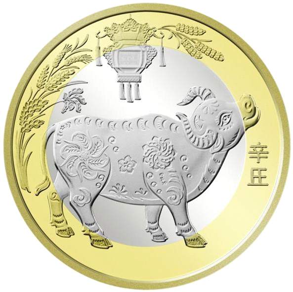 2021年贺岁普通纪念币正面图案为“中国人民银行”“10元”字样、汉语拼音字母“SHIYUAN”及年号“2021”,底纹衬以团花图案。背面主景图案为中国传统剪纸艺术与装饰年画元素相结合的一头抬头牛造型,衬景图案为花灯和五谷,币面左侧刊“辛丑”字样。纪念币面额为10元,直径为27毫米,材质为双色铜合金,发行数量为1.5亿枚,其中,预约兑换数量1.4亿枚(含留存历史货币档案1万枚),装帧销售数量0.1亿枚。