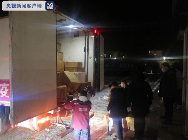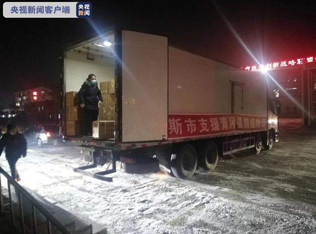 1月19日,黑龙江省佳木斯市将对口支援绥化市青冈县的防控物资送抵青冈县人民医院。
