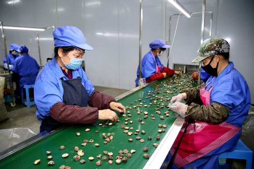 2020年3月26日,在湖北省十堰市郧阳区一家香菇产业发展有限公司,工人在香菇加工流水线上分拣香菇。郧阳区金融机构向这家香菇企业发放支农贷款,支持企业对当地农户滞销的香菇进行收购。新华社发(曹忠宏 摄)
