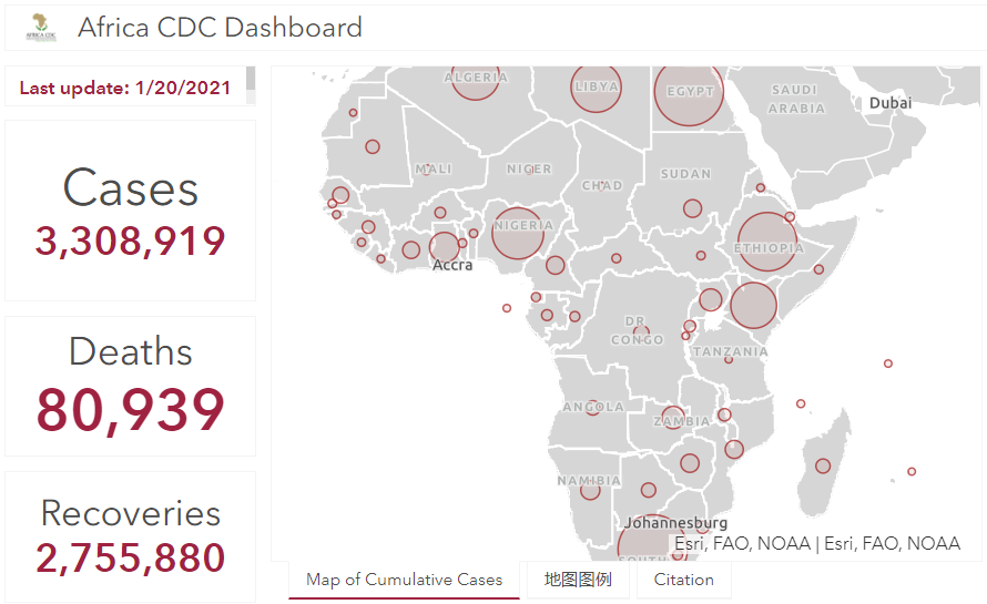 据非洲疾控中心统计数据,截至当地时间2021年1月20日12时,非洲大陆累计确诊病例达3308919例,累计死亡80939例,累计康复2755880例。(总台记者 吴婷)