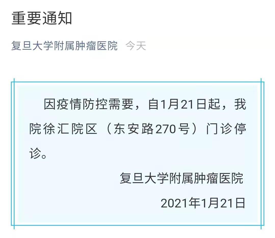 上海复旦大学附属肿瘤医院发布通知:因疫情防控需要,自1月21日起,复旦大学附属肿瘤医院徐汇院区(东安路270号)门诊停诊。(总台央视记者 池平)