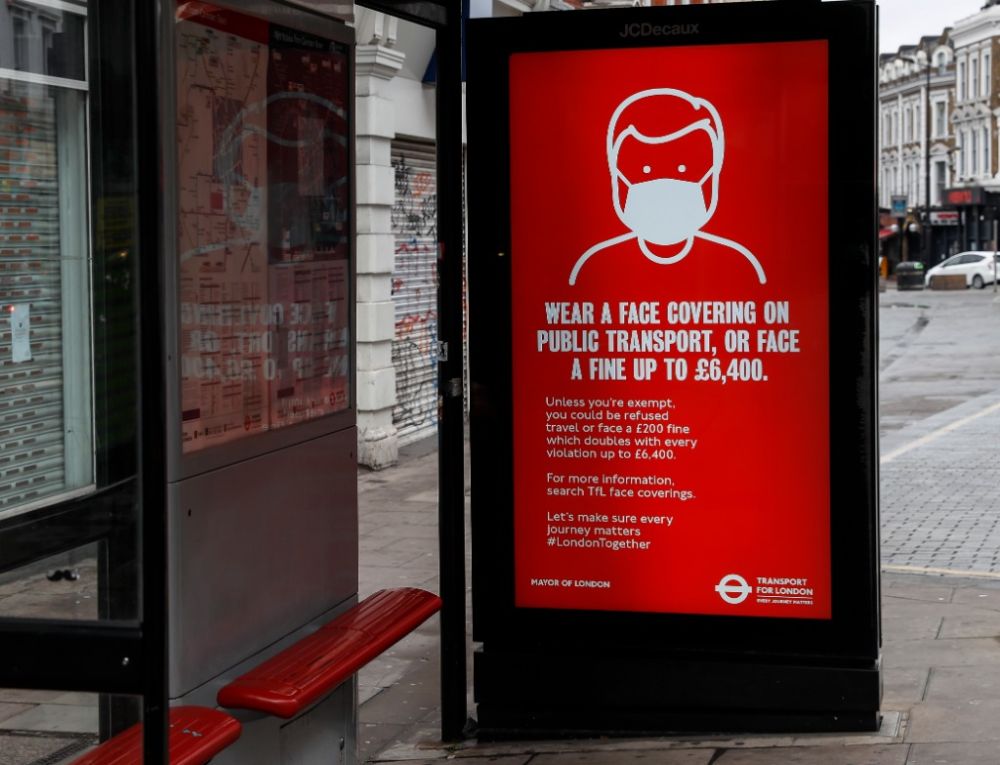 1月19日在英国伦敦一处公交车站拍摄的提示牌,提醒乘客必须佩戴面部遮盖物,否则面临最高6400英镑(约合56500元人民币)的罚款。(新华社记者韩岩摄)