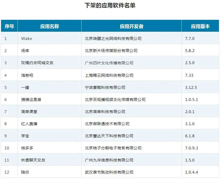 依据《网络安全法》和《移动智能终端应用软件预置和分发管理暂行规定》(工信部信管〔2016〕407号)等法律和规范性文件要求,组织对上述12款APP进行下架。相关应用商店应在本通报发布后,立即组织对名单中应用软件进行下架处理。